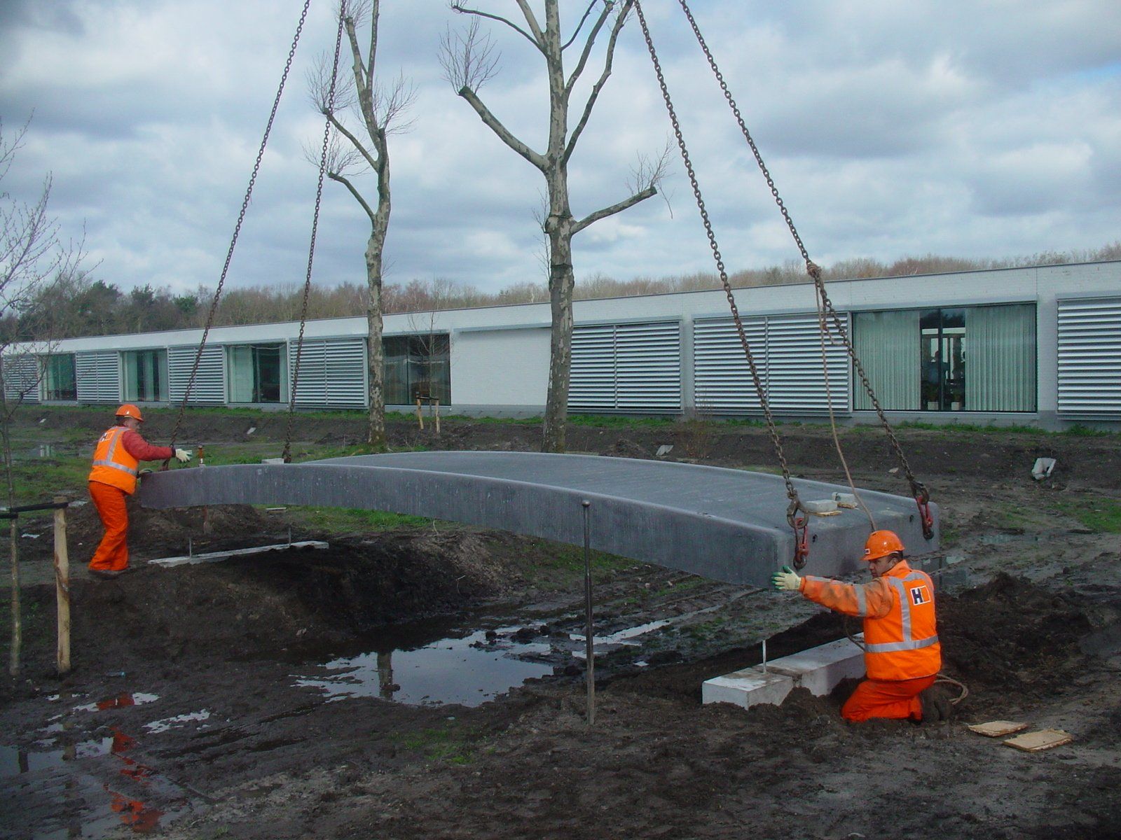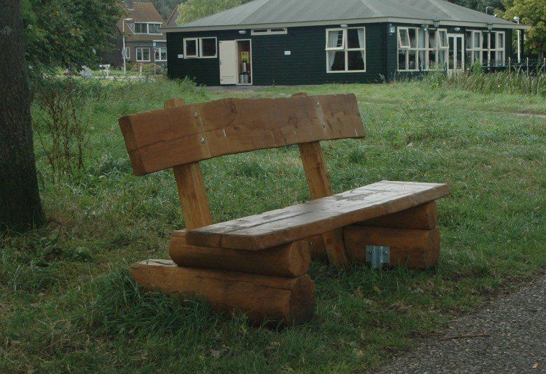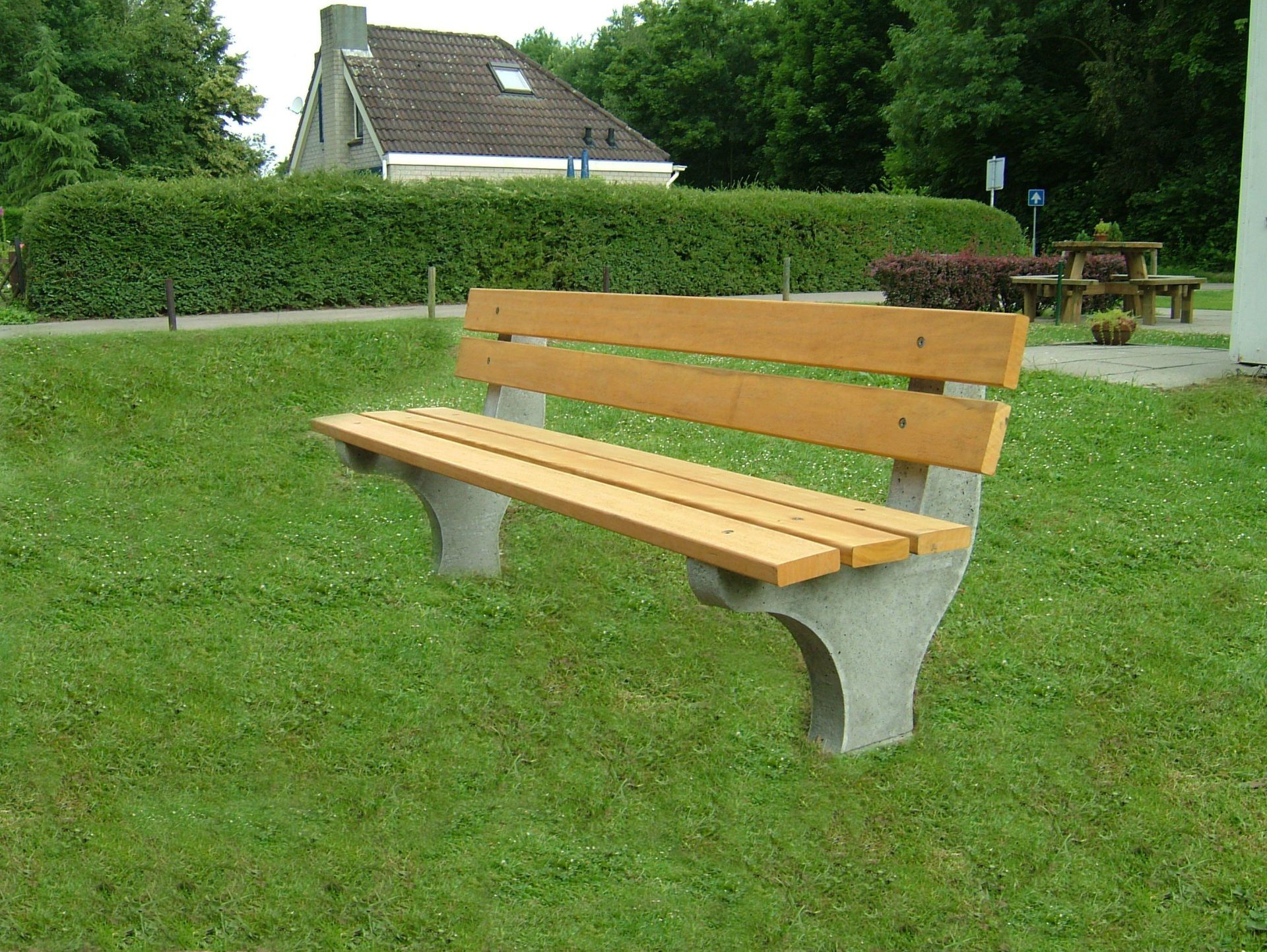 Robuuste tijdloze parkbank met 2 betonnen poten om in te graven en 5 hardhouten planken.