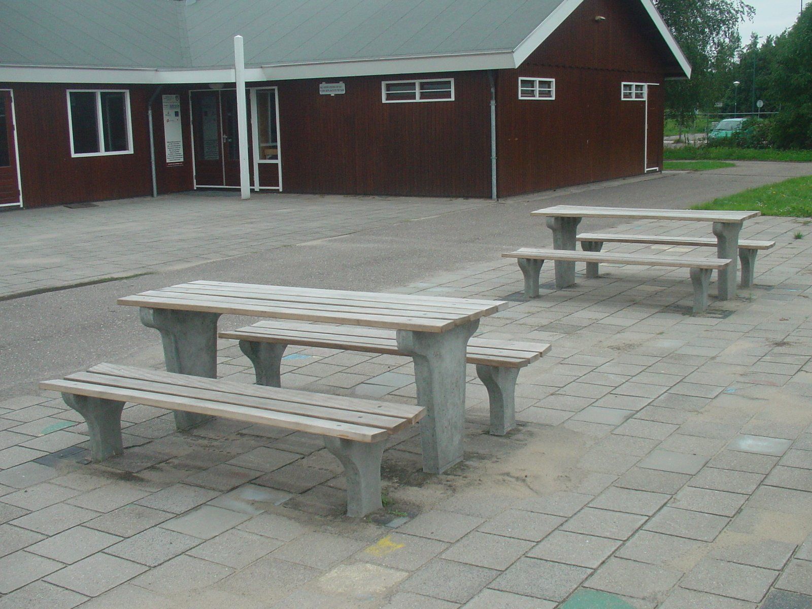 Bestaande uit een tafel met 5 hardhouten planken en 2 banken zonder rugleuning.
